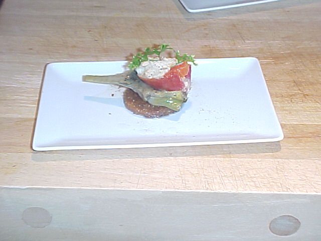This refined amuse bouche layers the delicate bitterness of baby artichokes with perfumed olive oil, herbs, savory tuna, Parmigiano Reggiano, and roasted tomato sweetness. It is a small-format appetizer with strong restaurant presentation value.